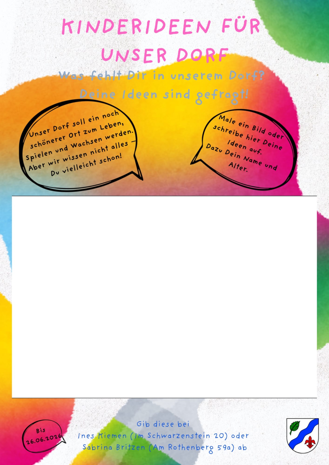 Bis zum 26. Juni 2026 sammeln wir eure Vorschläge und Kunstwerke ein. Ihr könnt sie bei Ines Kiemen, Im Schwarzenstein 20 oder bei Sabrina Britzen, Am Rothenberg 59a abgeben oder im Briefkasten einwerfen.